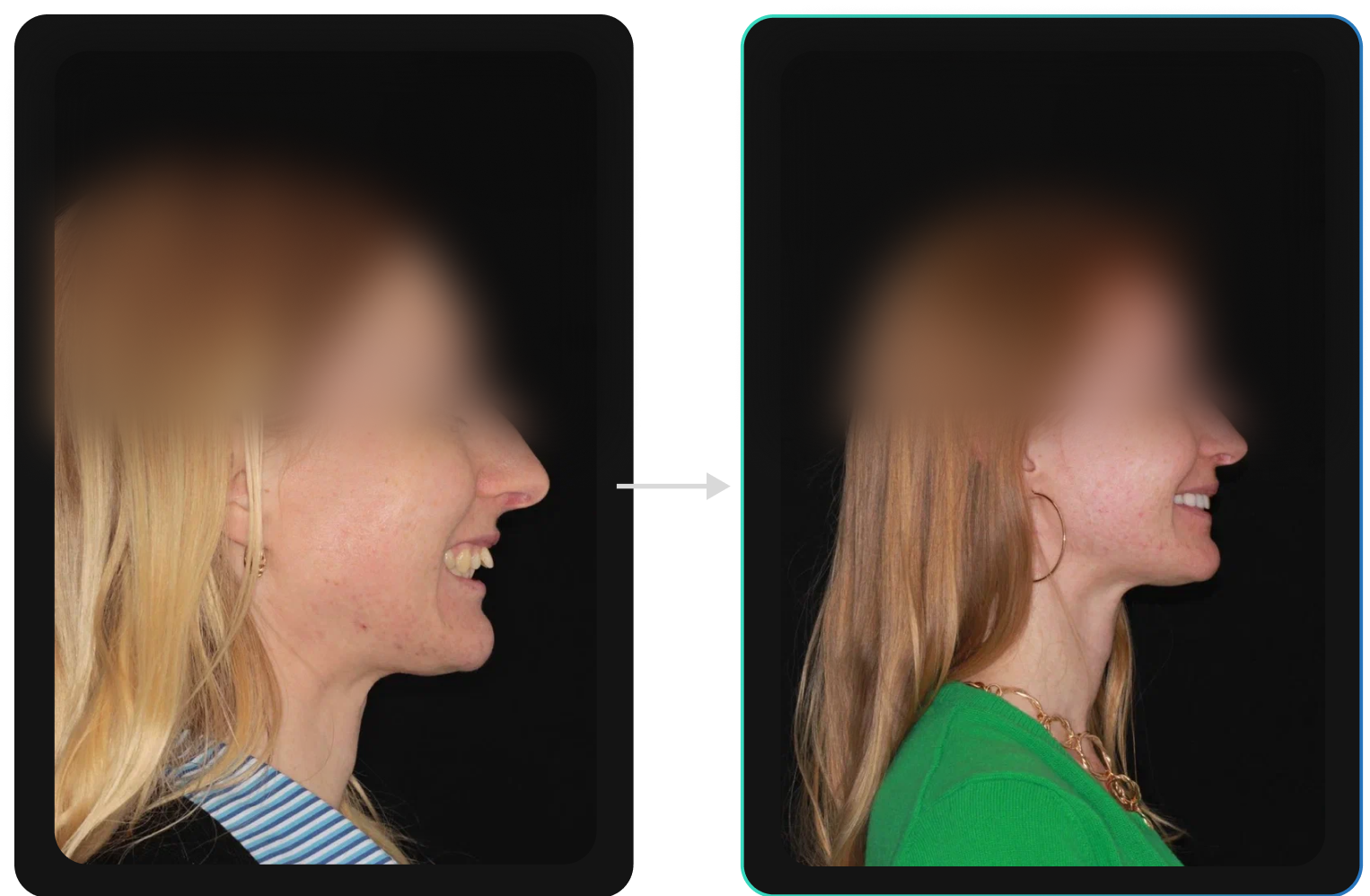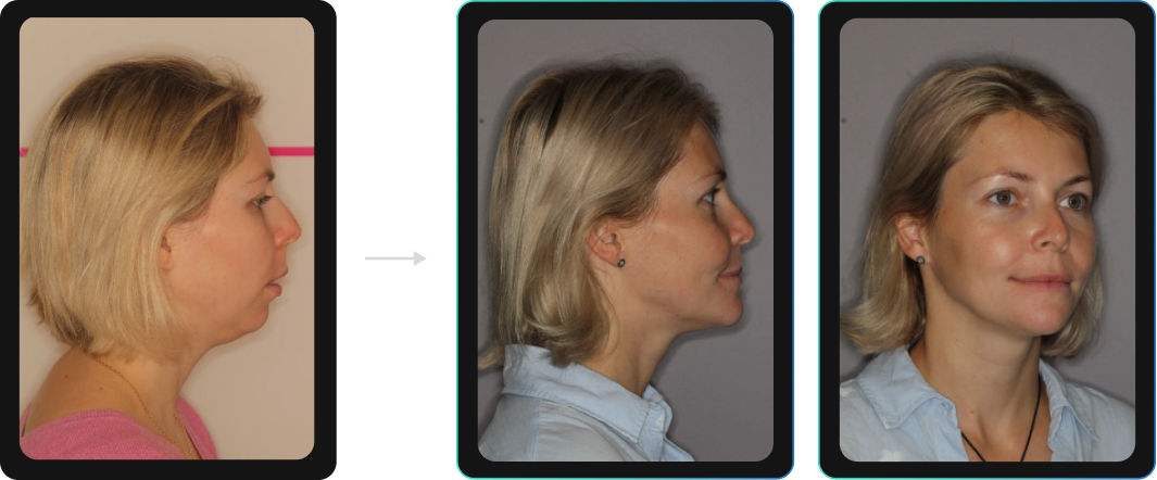 выявили скелетную асимметрию размеров челюстей (скелетный дистальный прикус), заднее положение подбородка и дисфункцию ВНЧС из-за дислокации суставных дисков и деформации головок сустава, что привело к скошенному профилю.